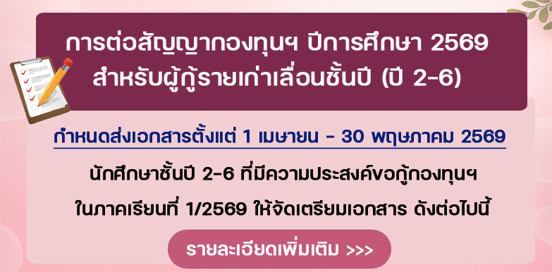 | นักศึกษาที่ลงทะเบียนเรียนเรียบร้อยแล้ว ให้เข้าระบบเพื่อยืนยันการเบิกเงินกู้ยืม ภาคเรียนที่ 2/2568 (บันทึกค่าเล่าเรียน/ค่าครองชีพ) ผ่าน Application กยศ. Connect หรือ https://wsa.dsl.studentloan.or.th และพิมพ์แบบยืนยันการเบิกเงินกู้ยืม(Click ดูตัวอย่างเอกสารทั้งหมด 1. แบบยืนยันการเบิกเงินกู้ยืม จำนวน 1 ฉบับ 2. สำเนาบัตรประชาชนผู้กู้ยืม จำนวน 1 ฉบับ 3. สำเนาบัตรประชาชนผู้แทนโดยชอบธรรม จำนวน 1 ฉบับ (กรณีผู้กู้ยืมอายุไม่ครบ 20 ปีบริบูรณ์) * สำเนาเอกสารทุกฉบับต้องลงลายมือชื่อรับรองสำเนาถูกต้องโดยเจ้าของเอกสารเท่านั้น |