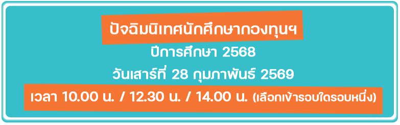 ปัจฉิมนิเทศฯ ปีการศึกษา 2568 (28 ก.พ.69) 13/02/2026 Wannisa Khamhomruen Uncategorised ขอเชิญ นักศึกษากองทุนชั้นปีสุดท้าย และผู้ที่กู้ครบตามหลักสูตรเข้าร่วมประชุมปัจฉิมนิเทศ เพื่อรับฟังการชี้แจง “ระเบียบ หลักเกณฑ์และการชำระหนี้คืนเงินกองทุน กยศ.” ผ่าน ZOOM Link เข้าร่วมประชุม : https://us05web.zoom.us/j/5361307780?pwd=ltDnxJXlCMoEqEEYZ56xEeqvkTPgEA.1&omn=84912948732 Meeting ID : 536 130 7780 Passcode : loansiam