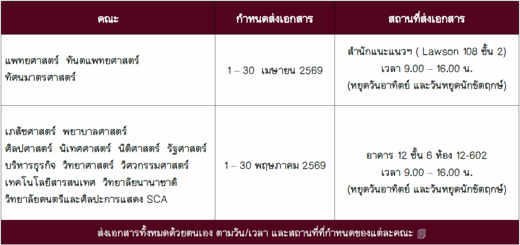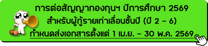 | *** ผู้ที่ไม่ส่งเอกสารตามกองทุนฯ กำหนด ถือว่าไม่ประสงค์กู้ต่อในปีการศึกษา 2569 *** สอบถามเพิ่มเติม โทร. 02-868-6860, 02-867-8000 ต่อ 5115, 5330 |